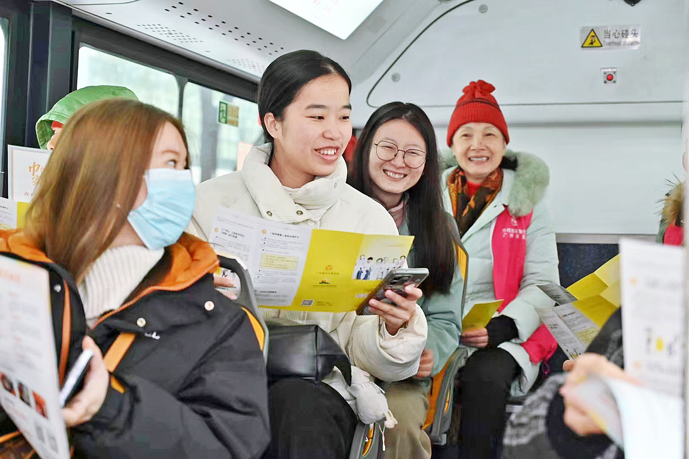 近年来,公司积极推进“公交+”融合发展,打造窗口里的普法公交力量,推动巾帼普法进万家。此次亮相的巾帼普法主题车选取的是2路线,连贯东风东路、东风中路和东风西路。该普法主题巴士以柔和的淡黄为背景底色,车身分别涂装广州市妇联维权热线、广州地标建筑,并点缀了一朵朵灿烂盛开的红棉花,温馨的车厢内还设有普法视频,为群众打造了一个沉浸式移动普法阵地,使法律法规与群众“面对面”“零距离”。车厢上,志愿者向市民乘客发放妇女权益保障法的宣传资料,解读法律亮点,增强市民法律素质,利用法律武器维护合法权益。