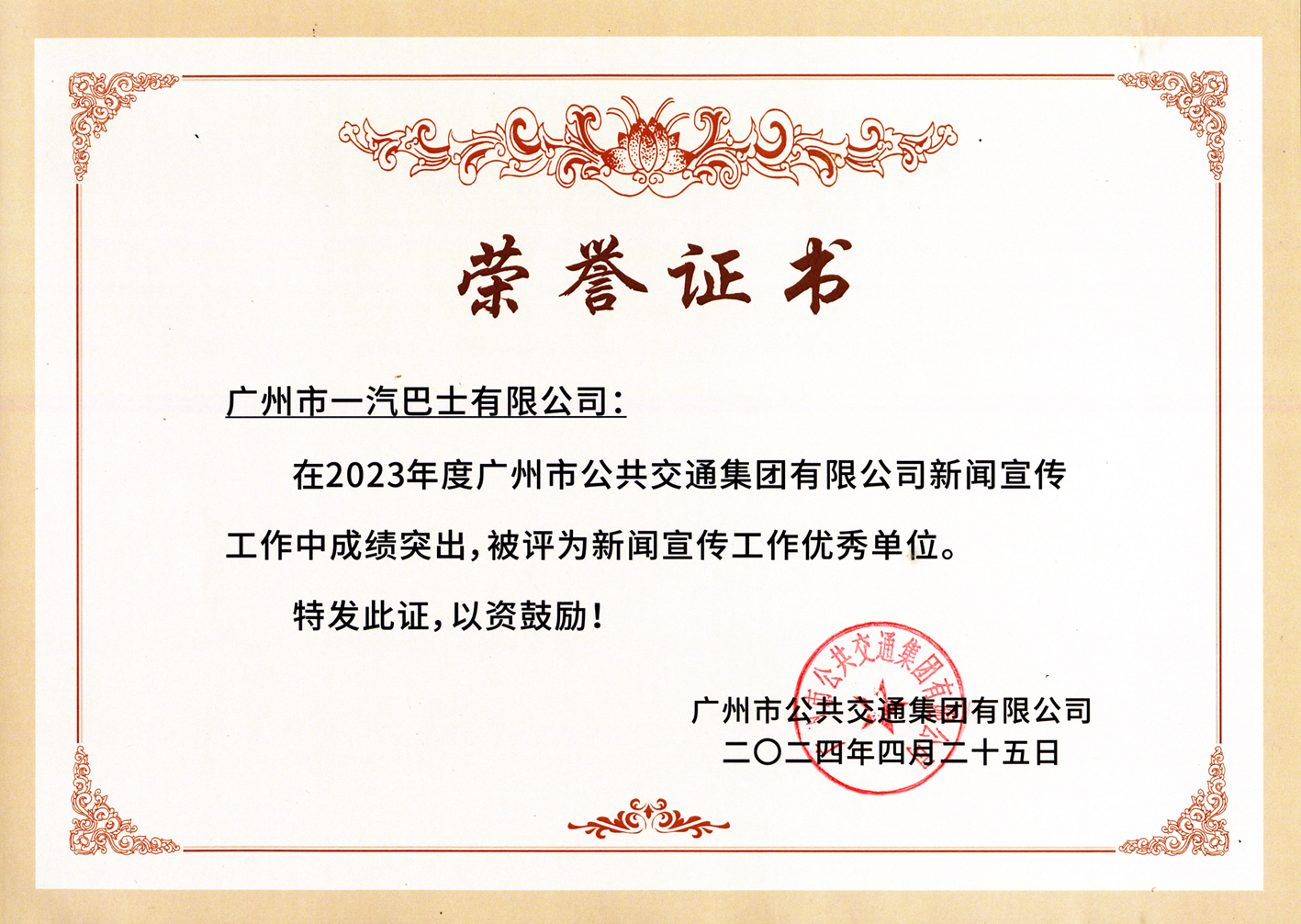 和品牌形象,讲好一汽发展故事,全年获市级及以上媒体正面报道近1600篇次;“这厢有礼”服务品牌荣获第四批“广东省交通运输文化品牌”称号,入选“国企品牌卓著工程”创新成果;公司打造了全国首条粤语相声主题公交,擦亮公交城市文化传播的流动窗口。1路线荣获全国城市公交“传承发展线路”称号,成为华南地区唯一一条获得此殊荣的公交线路。