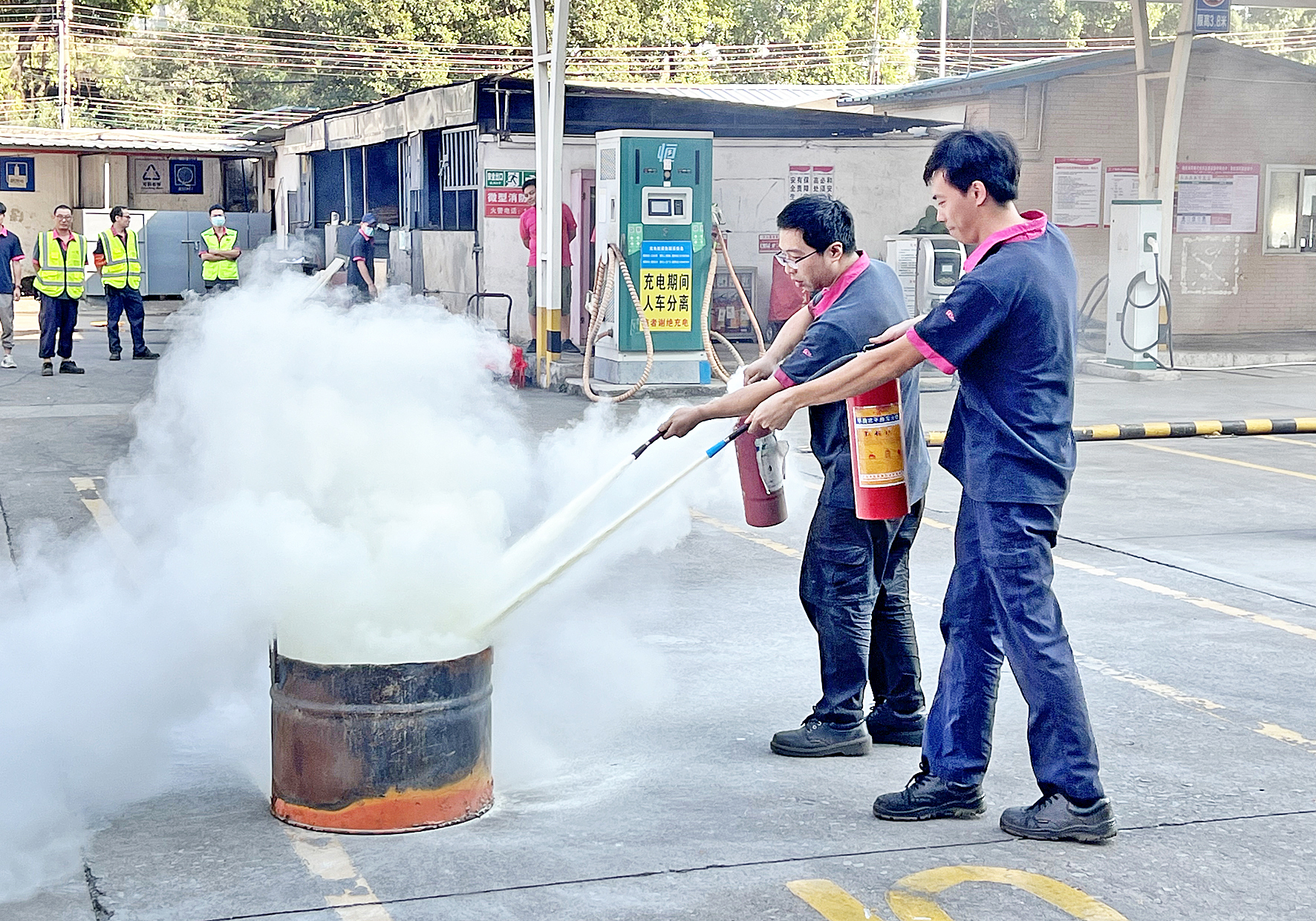 11月12日,维修分公司携手天河区交通局、天河区黄村街道应急办及黄村西社区居委会在黄村车间开展消防应急演练。结合生产及近期重点消防事件,演练设置纯电动公交车充电自燃起火处置、火灾现场车辆紧急疏散处置及消防器材实操等环节。演练开始,模拟一辆正在充电的公交车突然车底冒出浓烟,充电工确认电池仓冒烟后,迅速切断充电桩电源,拔出充电枪,快速使用场内消防栓水带射水降温,同时拨打“119”报警;当班负责人立即组织人员拉起警戒线,指挥移车工第一时间疏散受火源威胁最大的车辆,然后将火灾现场停放车辆迅速有序开离场地。纯电动公交车充电自燃起火及现场车辆紧急疏散的全流程应急救援处置增强了本次演练实效,让员工对应急处置流程入脑入心。