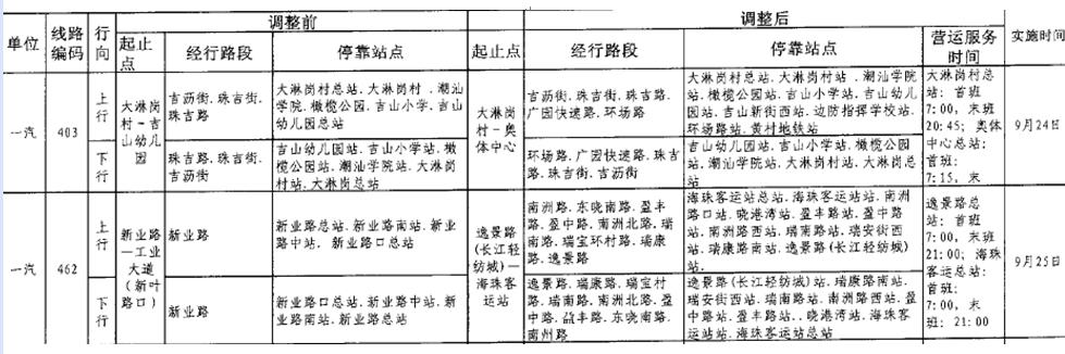 一、调整我公司403路、462路2条线路设置,具体线路起止点、经行路段、停靠站点及营运计划等调整情况见附件。