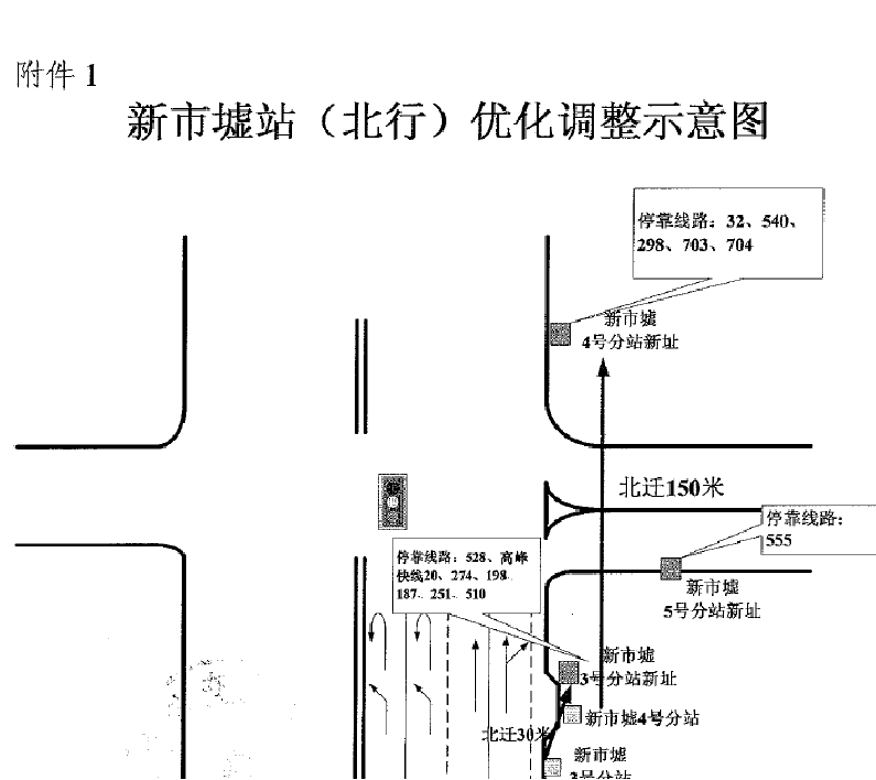 新市墟站(北行)1号分站往南迁移约180米;3号分站往北迁移30米至原4号分站港湾站内;4号分站往北迁移约150米;在齐富路路段增设5号分站。调整后各分站停靠线路安排详见附件。