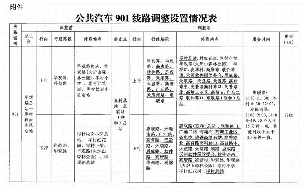 经广州市交通委员会批准,同意我司901路线由岑村松岗小区至华观路调整为岑村至惠联路(联和),调整后线路具体行经路段、停靠站点等详见附件。